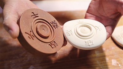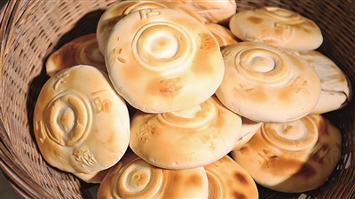 匠人们先用温水将老面引子化开成糊糊状待用,将专用面粉加入适量温水,发酵半小时。根据季节和温度不同,再添加适量未发酵的水面,进行反复揉搓至柔软发亮无硬块的使用标准。揉好的面用擀面杖擀制成面饼,表面涂抹当地的特制压榨花生油,然后卷直并依次揪出二点八两左右的剂子,轻揉成圆团,醒发备用。醒好的面团用手掌按成8厘米左右的面饼,然后用专用的模具再按压成型。