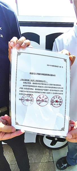 低速无人驾驶车辆道路测试通知书。
