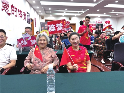 陈梦妈妈(右)陪92岁的姥姥一起观战。高静文 摄