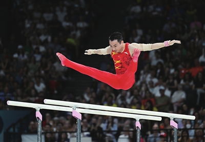 当日,在巴黎奥运会体操男子双杠决赛中,中国选手邹敬园获得冠军。 新华社发