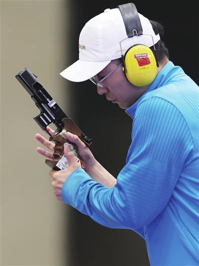 8月5日,山东运动员李越宏为中国队射落历史上首枚男子25米手枪速射金牌。图为李越宏在比赛中。新华社发