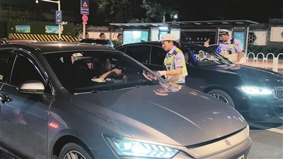 ◀交警在珠江路设卡查车。 刘卓毅 摄