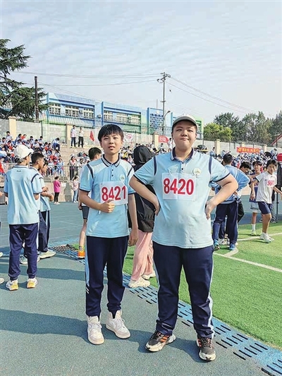 姜皓元(右)积极参加学校运动会。