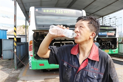 “公交车为乘客服务,我们为公交车服务,公交车维修不能有半点马虎,必须确保每一辆公交车‘健康’上路,为公交安全运营保驾护航,我们付出再多也值得。”赵宗阳说。据工作人员介绍,高温期间,修理工的任务比平日要多,但他们不叫苦、不叫累,每天坚持完成所有保修任务,坚持坏车不过夜,无论如何都要确保车辆及时上线营运。为此,除了准备冰水和绿茶外,每天还让食堂熬好绿豆汤,冰好后送到员工手中。在高温期间,还为修理工送上冰的盐汽水和冰棒降温,中午最热的时候,修理工可以在休息室休息,等到气温稍降再继续投入维修工作。