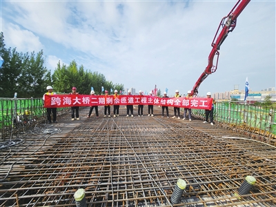 本报8月13日讯 跨海大桥高架路作为岛城东西快速交通的“第三横”,在串联城市交通、打通东西堵点方面发挥了重要作用。13日,记者从市住房城乡建设局获悉,随着南向西定向匝道最后一联现浇梁混凝土完成浇筑,跨海大桥高架路二期剩余匝道项目主体结构施工全部顺利完成。