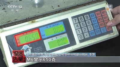 江苏南京市高淳区市场监管局漆桥分局副分局长李萍介绍:当时我们在这个摊位进行现场检查的时候,经营者正在使用这台秤,把砝码放到秤上之后,通过按M1到M6不同的按键,显示出来的重量读数是不一样的。