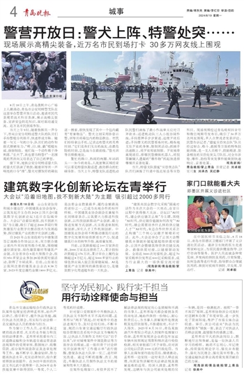 8月18日上午,青岛奥帆中心广场上人潮涌动,青岛市公安局特警支队在这里举办警营开放日活动,邀请市民代表观看战术科目表演,展示高精尖装备,宣讲安全防范知识,面对面沟通交流。近万名市民到场参加。