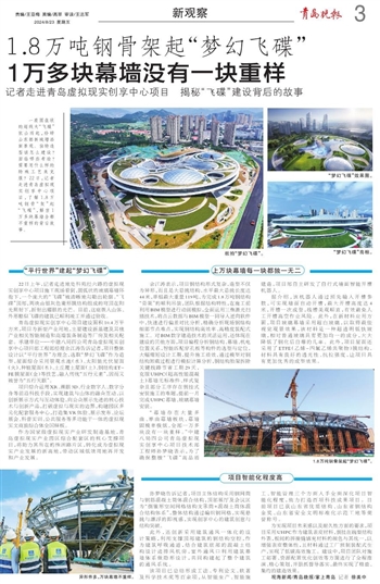 一座圆盘状的超级大“飞蝶”依山而起,给崂山东部新城增添新景观。独特造型该怎么建设?面临哪些考验?需要用什么样的特殊工艺来克服?22日,记者走进青岛虚拟现实创享中心项目,了解1.8万吨钢骨“架”起“飞碟”,解密1万多块幕墙全都不重样的背后故事。