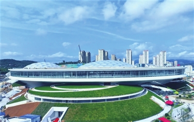 22日上午,记者走进地处科苑经六路的虚拟现实创享中心项目施工现场看到,圆弧状的玻璃幕墙环抱下,一个庞大的“飞碟”被清晰地勾勒出轮廓。“飞碟”顶部,两块由银灰色菱形膜结构组成的穹顶在阳光照射下,折射出耀眼的光芒。目前,这座嵌入山体、外形酷似飞碟的建筑已顺利竣工并通过验收。