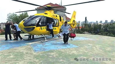 青岛市急救中心派出“空中120”紧急转运患儿和母亲。
