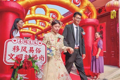 在征得新人同意后,“帮喜团”成员与新郎、新娘商定在婚礼当天的细微处“宣传”好移风易俗、文明新婚尚的理念。文明接亲游戏环节、婚房布置中的挂件、酒席上的文明用餐倡议书……这些婚礼上的小细节在潜移默化中影响着前来参加婚礼的宾客。此外,三河埠村还完善了《红白理事会章程》,结合村情民意制定了红白事操办标准,修订完善村规民约,积极将喜事新办、丧事简办等移风易俗内容纳入,并上墙公示、入户宣传,让村民入脑入心。
