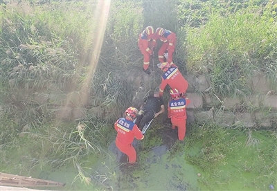 姜夏路消防救援站救援人员到场后发现,一名50岁左右的男子被困在水深约60厘米的水沟里,用手肘支撑着身体无法动弹。救援人员分为两组,一组架设拉梯,携带救援担架进入沟底,确认男子的腿部、胯部受伤后,将他抬到担架上;另一组绕到水沟另一侧,用安全绳固定担架后,两组互相配合,将被困男子救出抬上救护车。
