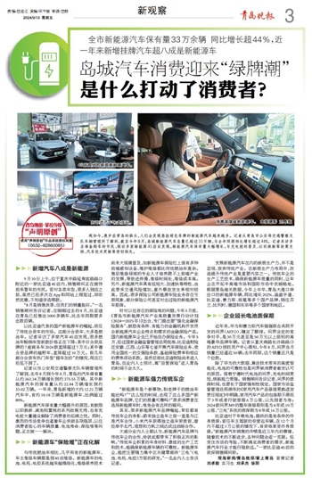 现如今,漫步在青岛的街头,人们会发现悬挂绿色车牌的新能源汽车越来越多。记者从青岛市公安局交通警察支队车辆管理所了解到,截至今年8月,岛城新能源汽车总量已超过33万辆,与去年同期相比增长超过44%。记者采访多名准备购车的市民、探访多家新能源4S店后发现,新能源汽车保有量大幅增长,与充电桩的普及、以旧换新等政策支持、汽车技术更新等密切相关。