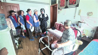 马怀龙手里拎着一个塑料袋,里面装着两根铁管、毛巾、头盔和警用雨衣。“群众家里有困难,我得帮他解决。”马怀龙一边说,一边顺着扶梯走到一户居民家门前,用钥匙打开防盗门。屋里住着的,是71岁的空巢老人王老汉,老人腰腿不好,行动不便;半年前,王老汉卧室窗外出现了一个马蜂窝,他没太在意,结果马蜂窝越来越大,到了夏天他都不敢开窗。前不久,马怀龙得知此事后决定,中秋节前要摘掉马蜂窝。马怀龙换上雨衣,用毛巾缠在脖子上,再戴上手套和头盔,做好全身防护后,将身子探出窗外,用铁管将马蜂窝捅下并装进口袋里,为老人排除了危险。“马警官本身就很忙,还记得我们这些老年人,真是太不容易了。”看见马怀龙为自己排忧解难,王老汉说。