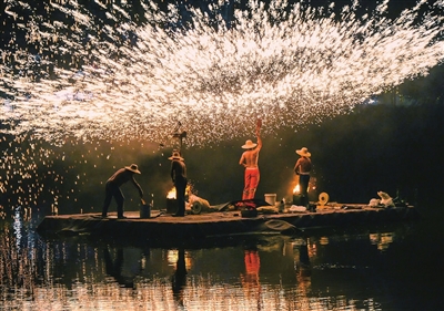 这是9月16日在安徽省宿州市砀山县梨小萌欢乐梨园景区拍摄的打铁花表演。新华社发