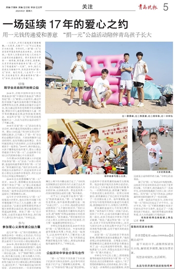 郭昊谦的爸爸对儿子的变化看在眼里。“虽然每年只参加一次线下活动,坚持了十多年,已成为郭昊谦日常生活的一部分,在孩子的成长中带来了很多正能量。”他说:“通过参加‘捐一元’活动,在孩子不仅变得更有同情心,还在与同学合作义卖的过程中学会了从不同角度考虑问题,这对于他未来的成长大有益处。”