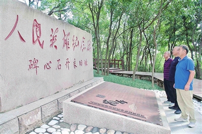 24日上午,记者与纪录片《人民英雄纪念碑——背后的故事》导演王绍君、崂山区沙子口街道大石村村委有关负责人刘昌泉,以及村里的三位老党员刘学林、王德庆、王开橹,一起走进青岛浮山森林公园西门,根据指示牌,经过一段石头小路,“人民英雄纪念碑碑心石开采旧址”的醒目石碑映入眼帘。