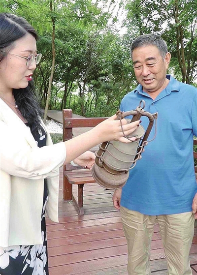 王绍君(左)向刘学林展示马灯。 栾丕炜 摄