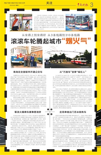 滚滚车轮给城市带来升腾不断的烟火气。交通工具的不断改进凸显了青岛城市的发展与活力。现如今青岛拥有公交线路310条、4927部车。一代代公交人以优质服务不断擦亮品牌。业界闻名的“一碗水”“老秒表”“问不倒”“四稳、四准、四不开”等老绝活,也都是在一代代公交人的摸索、总结和提炼中诞生并推广。在继承和发扬优良传统的同时,结合新时期新形势对公交行业的要求,我市先后涌现出“一口清”“景点通”“英语能手”“手语能手”等服务绝活。公交车的发展史就是青岛社会发展变迁的真实写照,平凡却一点一滴地改变着人们的生活。近年来,车辆从普通公交到空调车;从柴油车到新能源车;从买月票到刷卡支付,再到使用微信、支付宝扫码乘车。公交车的发展史,就像青岛城市发展的缩影。如今,走街串巷的公交车,市民出门百米就能轻松坐上,在提供便利的同时也增强了市民的幸福感和获得感。