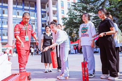 青年志愿者代表(左一)为农大学子传授应急救援技能。
