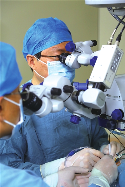 对眼科医生而言,精益求精的手术技巧与缜密的临床思维缺一不可。眼科手术缝线是头发丝粗细的四分之一,眼科医生必须借助显微镜小心翼翼地完成,只有不断磨练手术技巧,才能成就一台漂亮的手术。周占宇介绍,目前眼科中心深耕眼底手术的三大赛道,分别为糖尿病并发症、视网膜脱离、黄斑病变。“黄斑病变的手术治疗对主刀医生的手术技巧要求非常高,可以说是一台没有退路的手术,稍有差池就会造成不可逆的损伤,且无法弥补,导致手术后视力无法达到预期的效果,因此这是一台只准成功不许失败的手术。”周占宇介绍,高度近视的黄斑病变手术是难度系数最大的手术,术中的剥离、裁剪等均需要耐心和技巧,有时镊子和轻薄的视网膜的内界膜粘在一起,可能在主刀医生手部轻微抖动时的功夫就找不到了,这个小小的细节可能导致整台手术全盘皆输,因此对术者的要求极高,往往一台40分钟左右的手术是对医生手术技巧的极致考验。