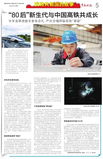 戴上焊帽,拿起焊枪,透过狭窄的防护屏,火花四溅的瞬间,会有一道耀眼的光芒,照亮他沉浸式工作的世界。39岁的电焊高级技师、中车青岛四方机车车辆股份有限公司车体分厂电焊工张合礼,从事高速动车组车体焊接工作15年来,完成焊缝超过70万米,成为中车首席技能专家。从时速250公里、300公里的动车组列车,到时速350公里的“复兴号”高速列车,再到时速600公里的高速磁浮列车……他是“80后”新生代中国高铁工人的杰出代表,与中国高铁共同成长。