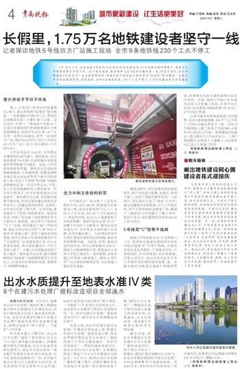 记者从青岛地铁集团获悉,国庆假期,全市9条地铁线路、230个工点不停工,17500名建设者坚守一线。目前,8号线南段土建工程累计完成88%,6座车站已封顶;2号线一期调整段(轮渡站-泰山路站)已开始试运行。三期7条线路已全面进入土建施工,100座车站已进入主体施工阶段。