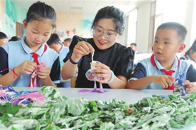 即墨区的小学生们在学习传统文化,制作手工艺品。