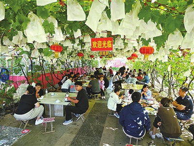 10月5日上午9时,来自烟台的孙明昊一家开车来到平度大泽山镇淄阳湖南岸的“印象大泽·萄源部落”。入住了部落特有的集装箱民宿后,孙明昊一家便来到了葡萄园。除了葡萄采摘,他们还游览了农趣盒子、童趣山丘、农耕课堂等亲子互动场所,晚上参加了露天烧烤活动并观看了烟花表演。以“亲子+研学”产业为核心的“印象大泽·萄源部落”结合田园生态,打造了集“吃、住、学、游、购、娱”为一体的农耕研学文旅综合体,并拓展了展览、培训、助农直播等产业链条,推动当地农业增效、农民增收。项目负责人徐嘉乐告诉记者,国庆假期游客以自驾游为主,每天游客接待量都在千人次以上。