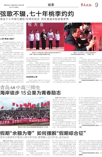 本报10月7日讯 每逢休假即将结束时,朋友圈里几乎都是满屏的“假期余额不足”的无奈。青岛市海慈医疗集团医务部副主任、临床心理科副主任医师王越表示,正确应对“假期综合征”,做好心理准备与调整作息,可有效缓解焦虑,更好地回归工作和学习生活。
