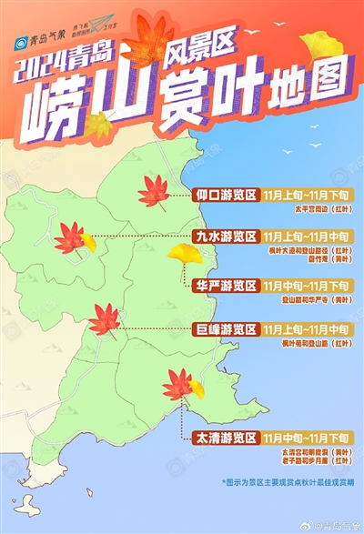 云卷寒风降,秋暮露成霜。霜降过后,秋色渐浓,树叶焕发出浓烈秋色,五彩斑斓像是打翻了的调色盘。25日,记者从市气象局获悉,随着气温走低,崂山景区的秋叶逐渐变色,一年一度的崂山秋叶最佳观赏季到了。为此,气象部门制作赏秋地图,方便市民近距离体验秋日之美。与此同时,我市公共交通也采取加密发车等多种方式,方便市民出行。