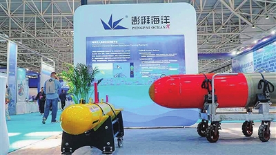 青岛澎湃海洋探索技术有限公司是我国海洋无人潜航器技术领军企业、国家级高新技术企业,主要研发和生产各类水下机器人系统及海洋设备配套产品。此次展会上,该公司带来的完全自主研发的大排水量自主式潜航器,重量1吨—1.5吨,最大工作深度6000米,可实现自动化的布放回收。