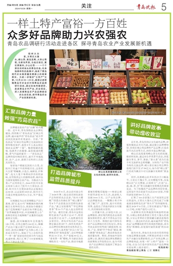 品牌建设是农产品“出圈”的关键一招。近年来,青岛围绕农业品牌化建设,持续做大“青岛农品”区域公用品牌,越来越多的“青岛农品”成为带动农民致富的有效途径。目前,“青岛农品”区域公用品牌已完成商标注册和版权保护,连续5年入选全国区域农业品牌“十强”。酸甜细腻的蓝莓、饱满多汁的葡萄、晶莹剔透的樱桃、香气四溢的蜜杏……“青岛农品”品牌持续叫响的背后,离不开当地政府、农户、企业、商家乃至科研人员的共同努力。