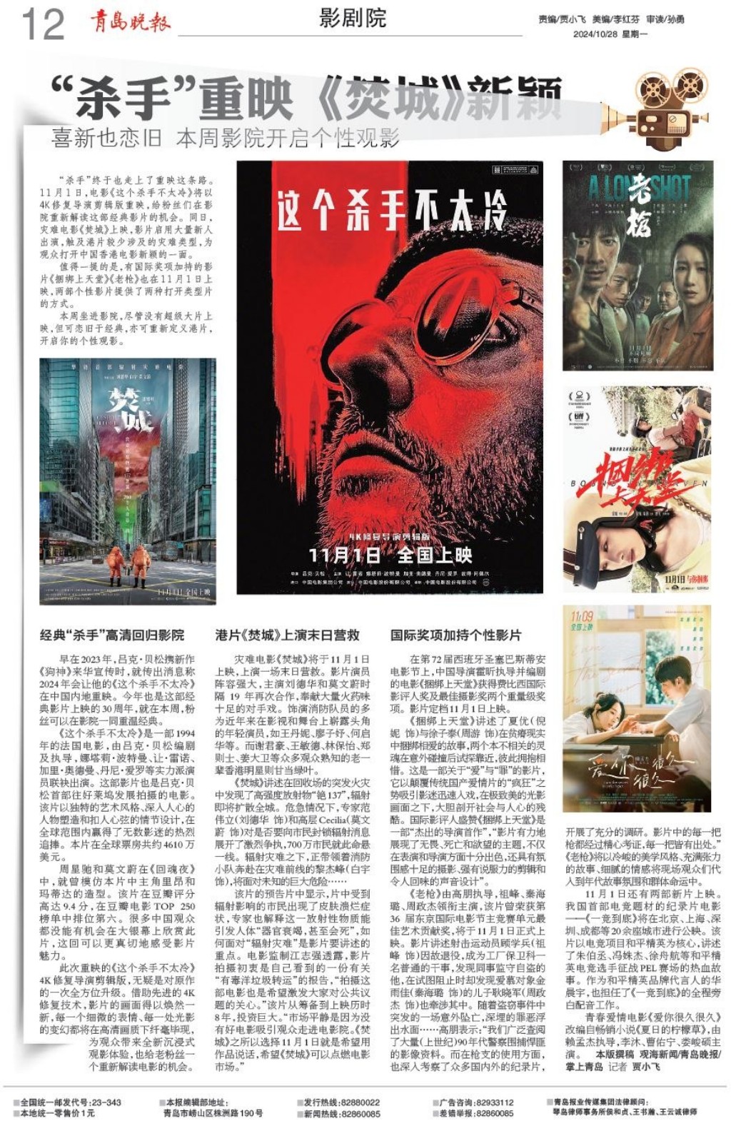 “杀手”终于也走上了重映这条路。11月1日,电影《这个杀手不太冷》将以4K修复导演剪辑版重映,给粉丝们在影院重新解读这部经典影片的机会。同日,灾难电影《焚城》上映,影片启用大量新人出演,触及港片较少涉及的灾难类型,为观众打开中国香港电影新颖的一面。