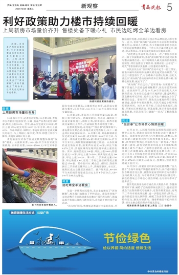 记者调查发现,在房地产“组合拳”政策影响下,青岛楼市效果凸显,体现在成交等数据上,从十一黄金周以来就持续向好。10月第3周,青岛新建商品住宅成交量为1009套,成交面积13.05万平方米,与此前一周的成交套数(820套)和成交面积(10.27万平方米)比,两项数据涨幅均超过两成。从各区域的成交情况来看,除莱西市成交46套,环比下跌4.17%之外,其他区域均呈现环比持平或上涨的走势。其中,高新区成交108套,环比上涨100%;即墨区成交116套,环比上涨70.59%;原黄岛区成交244套,环比上涨28.42%。第3周,二手房成交量1791套,环比微涨1.8%,这是二手房已连续两周成交量超过1700套。其中胶州市、崂山区、城阳区、西海岸新区二手房成交量环比上升,西海岸新区、市北区、城阳区成交总量居区域前三。就户型来说,80~100平方米的刚需房型成交占比上升4个百分点,120~140平方米占比降低。
