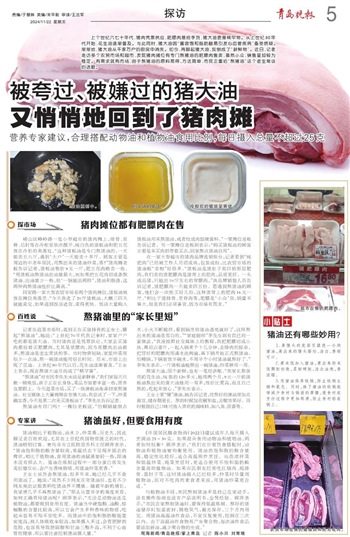 王女士更“懂”猪油,她告诉记者,往熬好的猪油里加点黄豆,储存期更长。熬的时候加花椒和盐,去腥效果好。同时根据自己口味可放入喜欢的调味料,如八角、茴香等。
