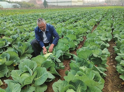 荆世新在田间指挥工人收获甘蓝,他一边熟练地拔起一棵水果甘蓝,一边对工人们喊道:“看这天气,估计明天就要降温了,大家得加把劲儿,加快采收速度!”工人们听到指令,加快了采收速度。
