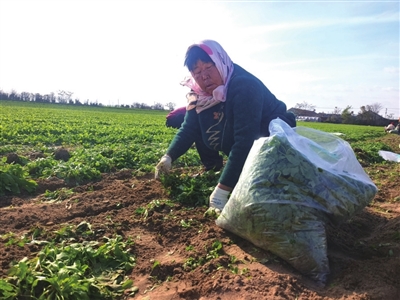 近日,记者来到平度市古岘镇大朱毛村,田间的大叶荠菜随风摇曳,三名村民忙着用机器铲出成片的荠菜,另外四名村民挑拣地头上已被挖出来的荠菜。“人工驯化的荠菜种子,种出来的荠菜很鲜嫩。纯人工种植,无激素,拒绝药残。”戴兴坤随手拿起田间挖出来的荠菜,向记者展示其鲜嫩的叶子。