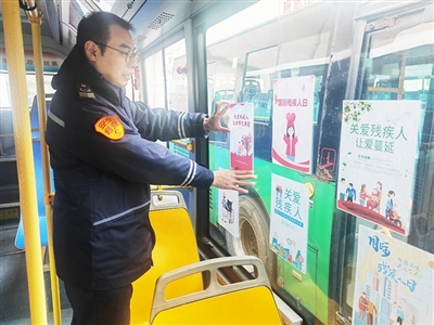 215路驾驶员梁帅在日常运行中时常关注残疾人群体,在“国际残疾人日”到来之际,他特意打造了一个主题车厢,通过走街串巷宣传的方式,呼吁更多人关爱残疾人群体。主题车厢的车窗位置张贴了各类宣传海报,车内还放有各类宣传手册,方便市民乘车途中随时取阅。他还制作了“爱心专座”的文明引导贴,贴在了车厢中部座椅上,引导上车市民关心爱护特需人员。