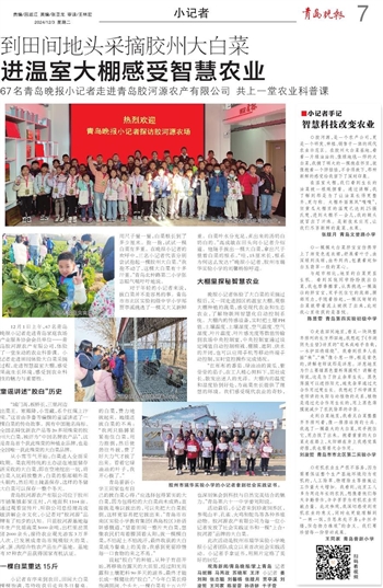 12月1日上午,67名青岛晚报小记者走进青岛家庭农场产业服务协会会员单位——青岛胶河源农产有限公司,体验了一堂生动的农业科普课。小记者走进田间体验大白菜采摘过程,走进智慧温室大棚,感受果蔬生长环境,感受到农业科技的魅力与重要性。