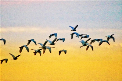刘祖青拍到这组照片,像素虽然没有那么高清,但已呈现出唐代诗人杜甫所描绘的场景:“两个黄鹂鸣翠柳,一行白鹭上青天”。