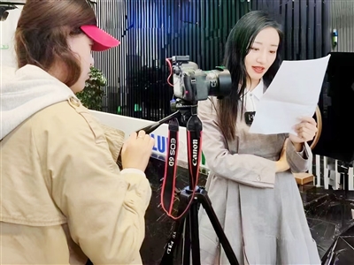 视频拍摄现场,萱莹(右一)在对拍摄脚本。(受访者供图)