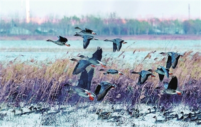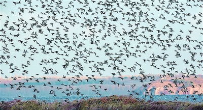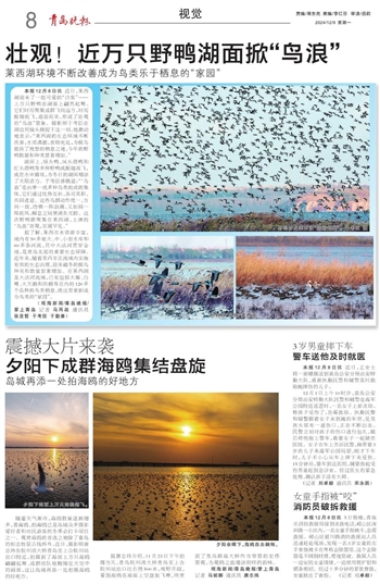 本报12月8日讯 近日,莱西湖迎来了一批可爱的“访客”——上万只野鸭在湖面上翩然起舞。它们时而聚集成群飞向远方,时而振翅疾飞,迎面而来,形成了壮观的“鸟浪”景象。摄影师于考臣在湖边用镜头捕捉下这一刻,他激动地表示:“莱西湖的生态环境不断改善,水质清澈,食物充足,为候鸟提供了理想的栖息之地,今年的野鸭数量和种类显著增加。”