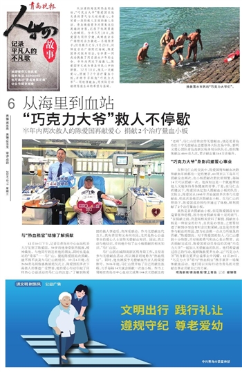 从汹涌的海浪到热血的血站,“巧克力大爷”陈爱国以他无畏的勇气与无私的爱心,书写着一段段感人至深的救人佳话。青岛晚报曾多次聚焦这位英雄的身影,记录下他英勇救人的瞬间。今年5月18日,陈爱国与同伴宁健、咸博在音乐广场附近合力救起一名遇险男子;仅仅数月之后,9月23日,同样在音乐广场附近海域,陈爱国再次挺身而出,与李勇一同成功挽救了两名溺水少年的生命。半年内两次下海救人,陈爱国早已成为青岛市民心中的骄傲。12月10日,他又一次献爱心,捐献了2个治疗量血小板,并将号召其他“巧克力大爷”一同组团献血,用实际行动继续传递生命的希望与温暖。