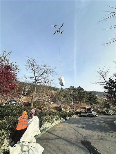 崂山区浮山森林公园在松材线虫病除治中,工作人员使用无人机调运疫木下山,在森林抚育栽植育苗中,使用无人机搬运苗木上山。采用大功率无人机,载重可达50公斤,一台无人机工作效率相当于人工的20倍,大幅节省成本和提高效率。自11月以来,浮山区域已累计清理疫木3400株,目前已成功实现疫点拔除目标任务。