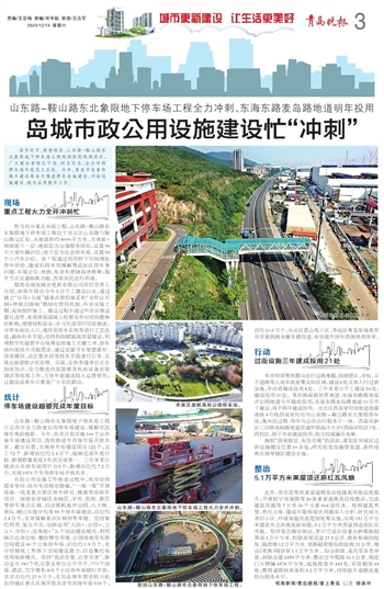 山东路-鞍山路东北象限地下停车场工程只是我市全力推进公共停车场建设、缓解市民停车难的缩影。今年,我市计划实施100个公共停车场建设项目,持续推进专用停车场开放共享。截至目前,实施停车场建设项目122个,完工72个、新增泊位约2.4万个,超额完成年度目标,新增数量连续5年居全省第一。三年来累计建成公共停车场项目215个,新增泊位约7.2万个,实现1571个专用停车场开放共享。