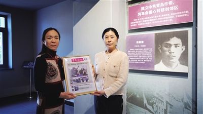 在纪念馆宣教中心和抗战馆内,醒目位置均有陈振麓的照片和生平事迹介绍。在青岛市革命烈士英名墙上,陈振麓的名字与王尽美、邓恩铭等烈士排在靠前位置。在陈振麓照片前,记者将《青岛晚报》的相关报道赠予陈艳。陈艳眼含泪花,一字一句地读着陈振麓的事迹。