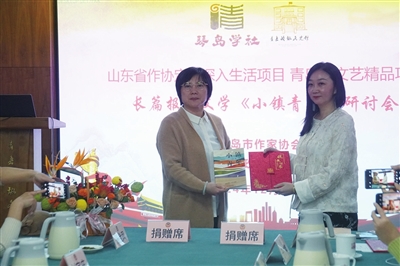 高方(右)向青岛政协文史馆捐赠《小镇青年》。