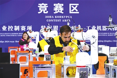 当日,第三届上合组织国家职工技能大赛在青岛市开幕,参赛技术工人代表在工业机器人操作调整工、智能制造工业控制、装配钳工3个项目中同场竞技。本次比赛旨在通过赛训结合、专题讲座、技能交流、企业参观等形式,促进上合组织国家职工技能交流、互学互鉴、增进友谊。 新华社发
