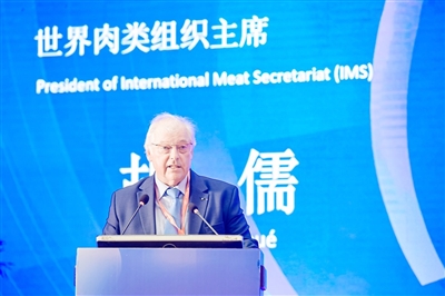 世界肉类组织主席Guillaume Roué为喜旺颁发“双金成员”证书。(企业供图)